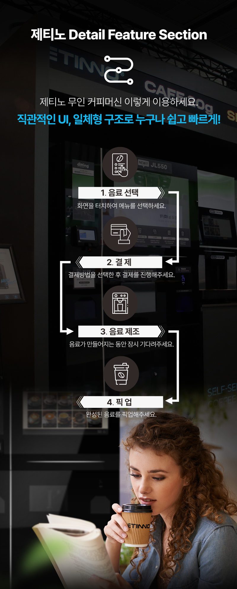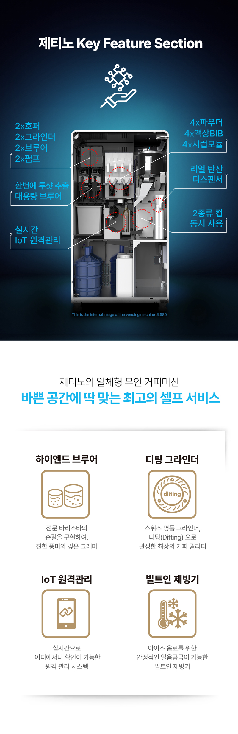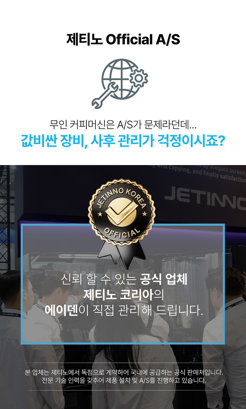 제티노는 커피머신 전문 기업으로, 전자동 커피머신과 무인카페 벤딩머신 하드웨어를 직접 제조할 뿐만 아니라 스마트한 IoT 통합관리 소프트웨어까지 함께 제공하여 최적화된 제품과 솔루션을 제공합니다.